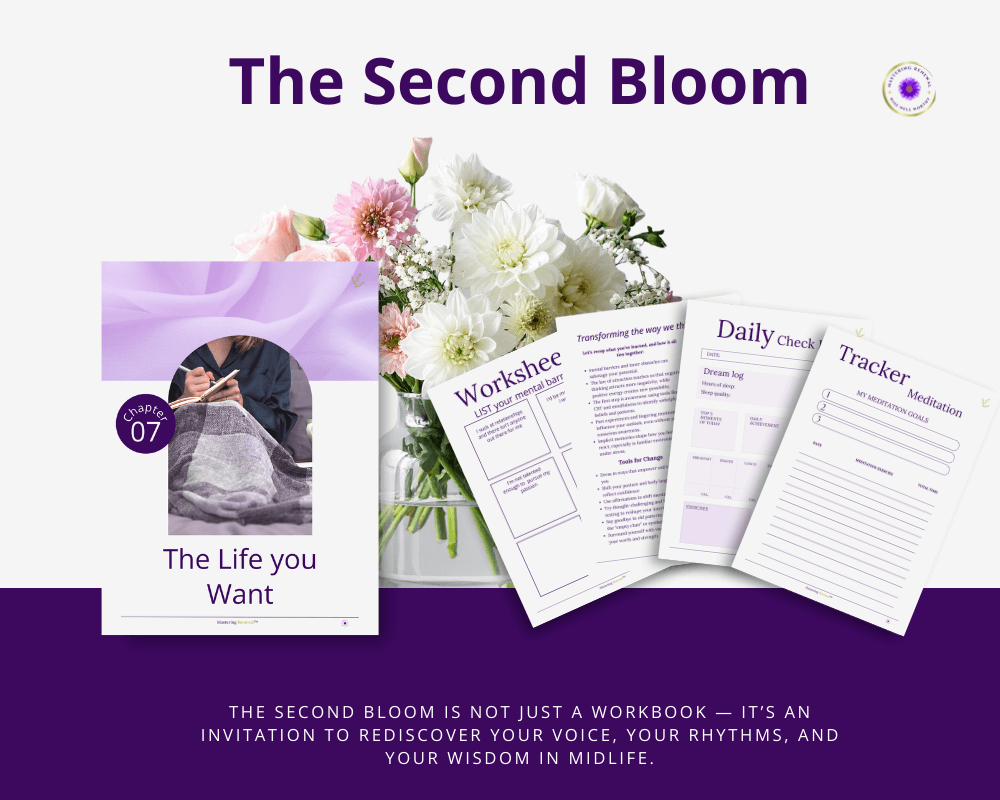 🌸 The Second Bloom Workbook for Midlife Women – An empowering journal experience designed for women navigating the transitions of midlife with grace, clarity, and inner renewal.